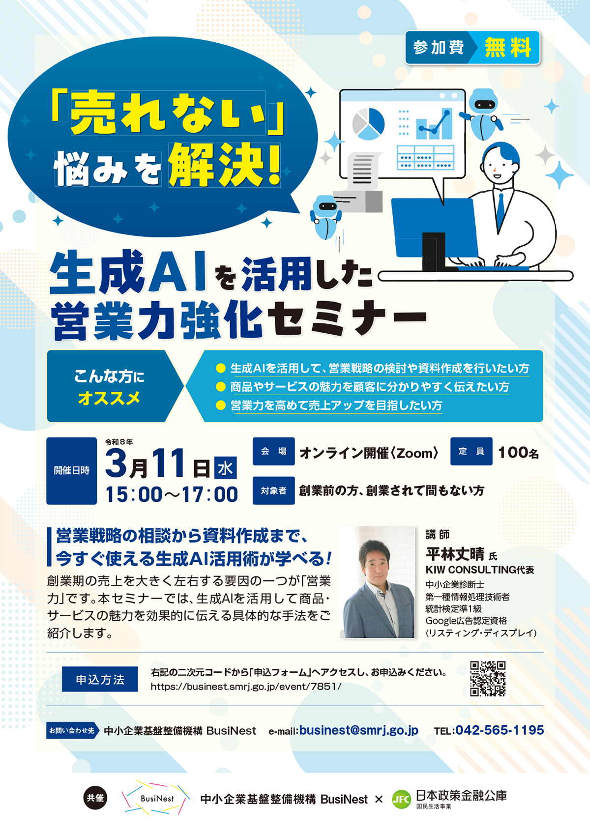 | 備考 | ●案内サイトURL https://businest.smrj.go.jp/event/7851/ ●主催 中小企業基盤整備機構 BusiNest ●お問い合わせ先 BusiNest |
