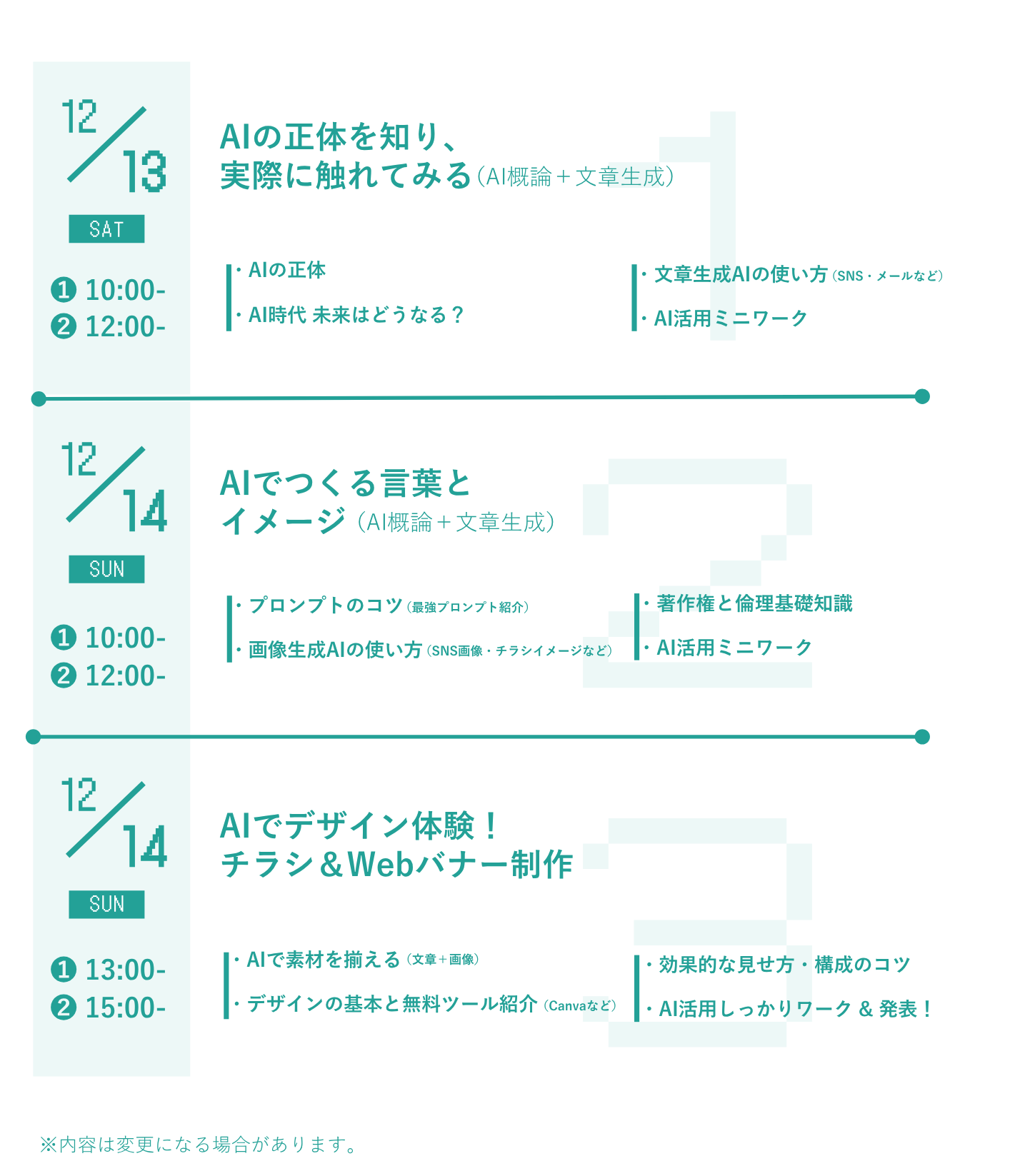 | 開催日時 | 第1回 2025年12月13日(土)10:00~12:00 第2回 2025年12月14日(日)10:00~12:00 第3回 2025年12月14日(日)13:00~15:00 |