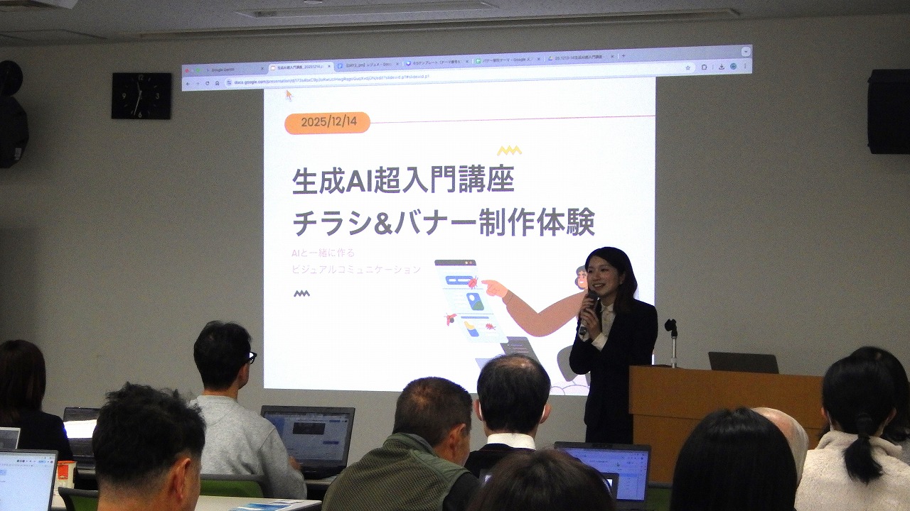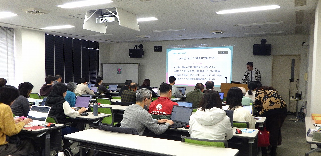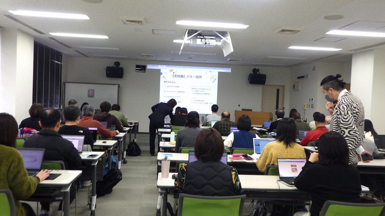 午後からは AIによるデザイン体験 として、チラシやバナーの作成に取り組みました。デザインツールを用い、講師からコツを学びながら各自が作品を制作。最後には発表会を行い、参加者同士で成果を共有し合う場となり、作品づくりを通じて、自然と笑顔が広がる時間となりました。